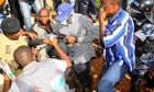 Kizza Besigye hit in the arm by rubber bullet with police firing teargas into a hospital as demonstrations break out across the country The main opposition leader, Kizza Besigye, has been hit by a rubber bullet while taking part in demonstrations against rising fuel and food prices. Police fired rubber bullets and teargas into a crowd of demonstrators marching towards the capital, Kampala. “Shortly after the firing began I was hit and I suspect it was a rubber bullet. I had sharp pain and [my] ring finger started bleeding,” Besigye told reporters at a Kampala hospital before he was taken for treatment. A police spokeswoman confirmed that Besigye had been shot and said officers were investigating. The skirmish broke out after police surrounded Besigye, with some of his supporters seeking shelter in a nearby hospital who then, according to one officer, started throwing rocks at police, who responded by firing teargas. A hospital worker in the town of Kasangati, just outside the capital, Kampala, said patients were affected and that some mothers moved sick children from their beds to escape the teargas. Besigye was arrested on Monday, along with several members of parliament, during a similar march protesting against high fuel and food prices, which police said was illegal. He was taken away by authorities again . Besigye is Uganda’s leading opposition politician and came second in Uganda’s February presidential election to Yoweri Museveni. There were also protests in at least four other cities on Thursday. West of Kampala, in Mbarara, motorcycle taxi drivers used their bikes to block the road in protest at rising fuel and food prices. The price of a litre of petrol has increased by almost a third in Uganda over the last month. The police branded the protests illegal and that anyone who got involved would be arrested. Besigye’s supporters chanted slogans about how the protests in Tunisia and Egypt had led to new governments. More than a dozen people were arrested. The police spokeswoman said petrol stations had been instructed not to sell fuel in containers after police received reports that some demonstrators would try to set buildings on fire. Uganda Protest guardian.co.uk